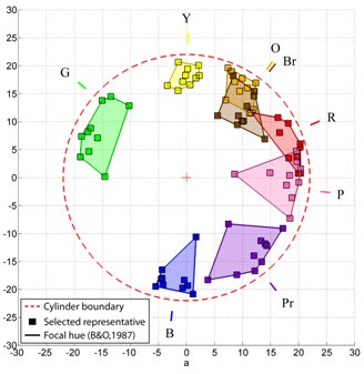 | Parametric model for Color Naming A full parametric model has been defined on the CIE lab space. Each of the 11 basic colour categories is modelled with a fuzzy set characterized by a combination of sigmoids as membership functions. | Related publications |